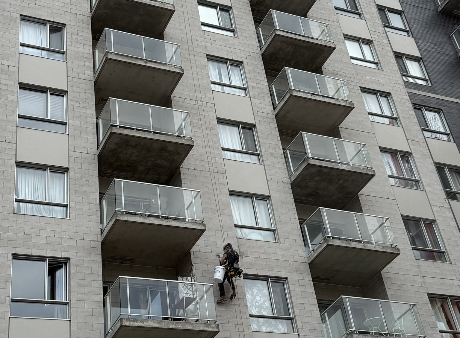 To maximize efficiency, the rope technicians used green stickers to mark intervention zones on the façade from the roof. This visual mapping system allows them to target areas for repair more precisely, without wasting time, a particularly useful technique in rope work, where the perspective is quite different from that offered by scaffolding, where defects are visible at eye level.