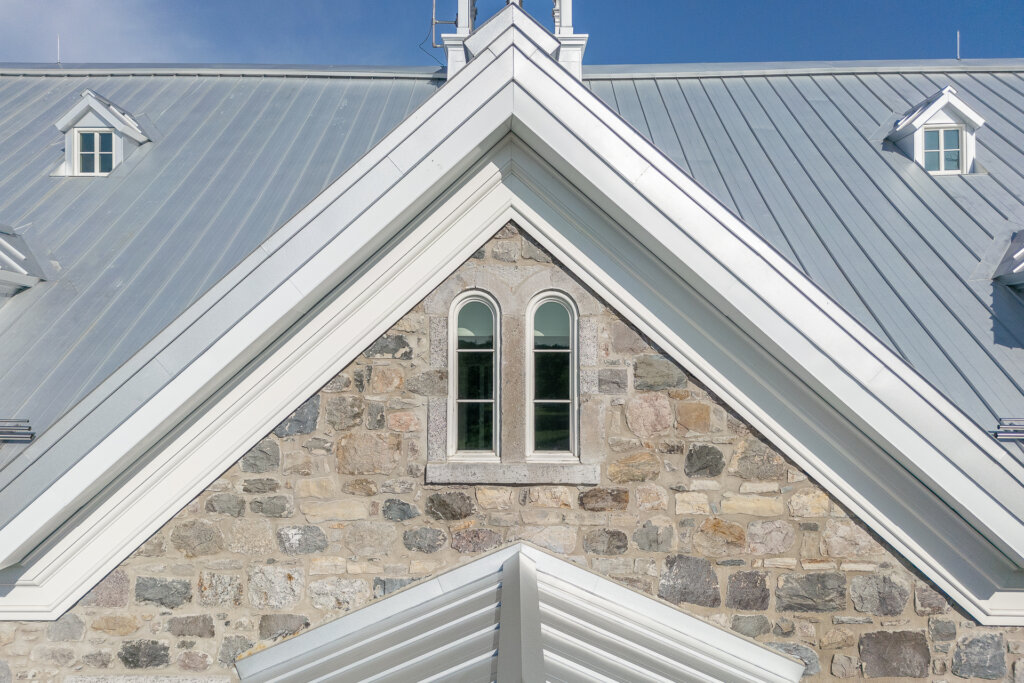 Notre équipe de restauration de maçonnerie a remplacé certains linteaux, des allèges et des jambages en pierre de calcaire. Un trait de scie a été réalisé dans la maçonnerie pour accueillir la nouvelle toiture en PVC. Des ouvertures ont été créées dans les murs de maçonnerie pour permettre l’installation de nouvelles poutres en acier, avec un remplissage au mortier autour de ces poutres pour garantir leur intégration. Les anciennes ouvertures destinées aux poutres des balcons démolis ont été obturées avec des pierres de moellon.